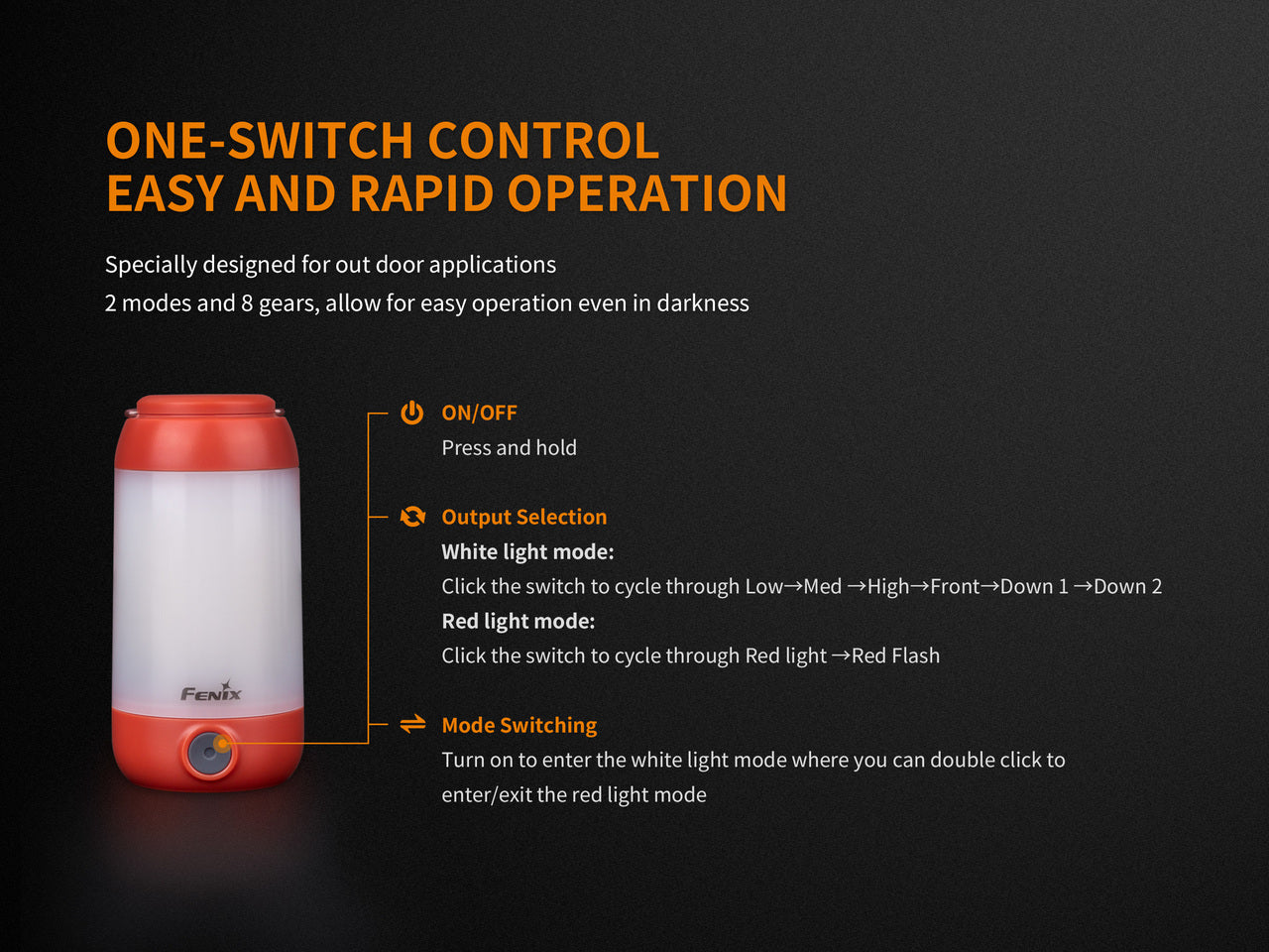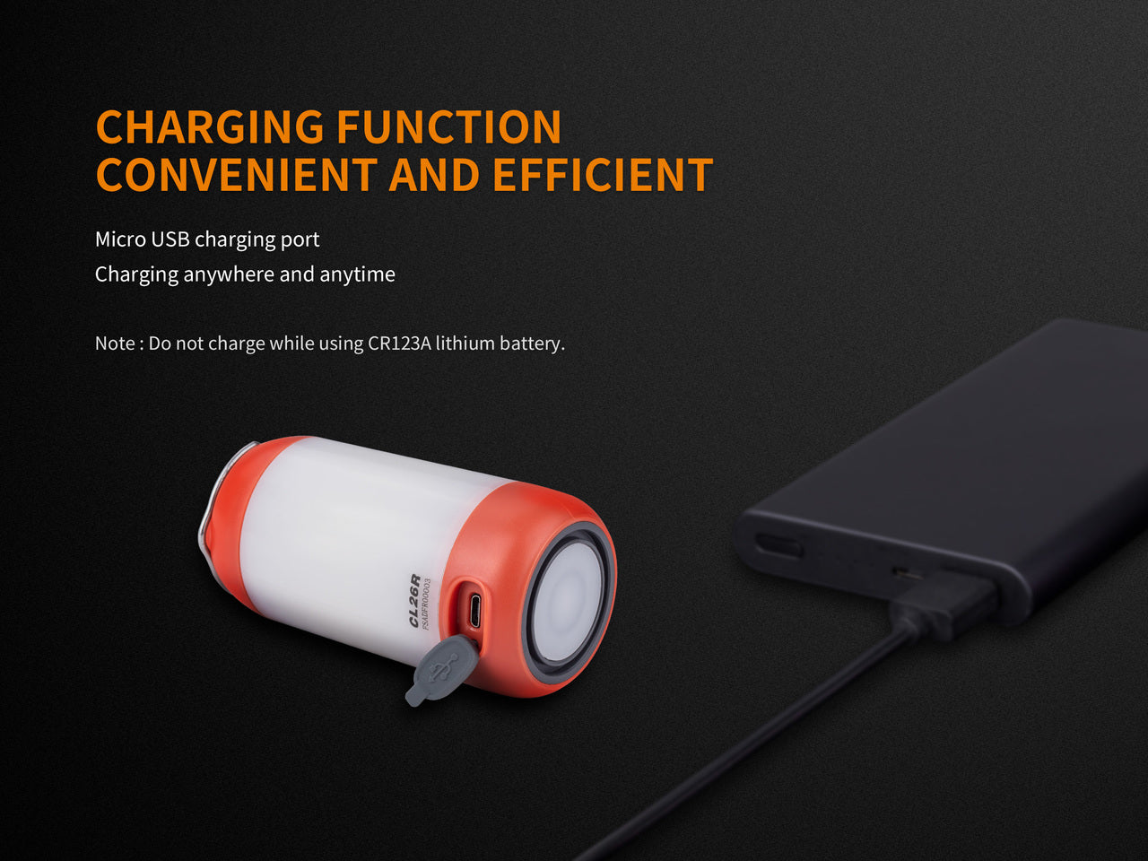 Regular price $59.95 Save $-59.95The CL26R camping lantern is here to light up your outdoor life. This small but mighty lantern packs 400 lumens of power with a 240-hour runtime on low. At max output, it runs for up to 5 hours with a beam distance of 82 feet. It's powered by a 2600 mAh 18650 rechargeable battery (included) or is compatible with two CR123 batteries (not included). The top of the lamp is magnetic, allowing you to hang it from any metal surface with ease. Its one-switch control makes it a cinch to turn on and access the 6 white and 2 red output levels. Choose from Red, Green, or Black - the CL26R is a must-have for any outdoors enthusiast!